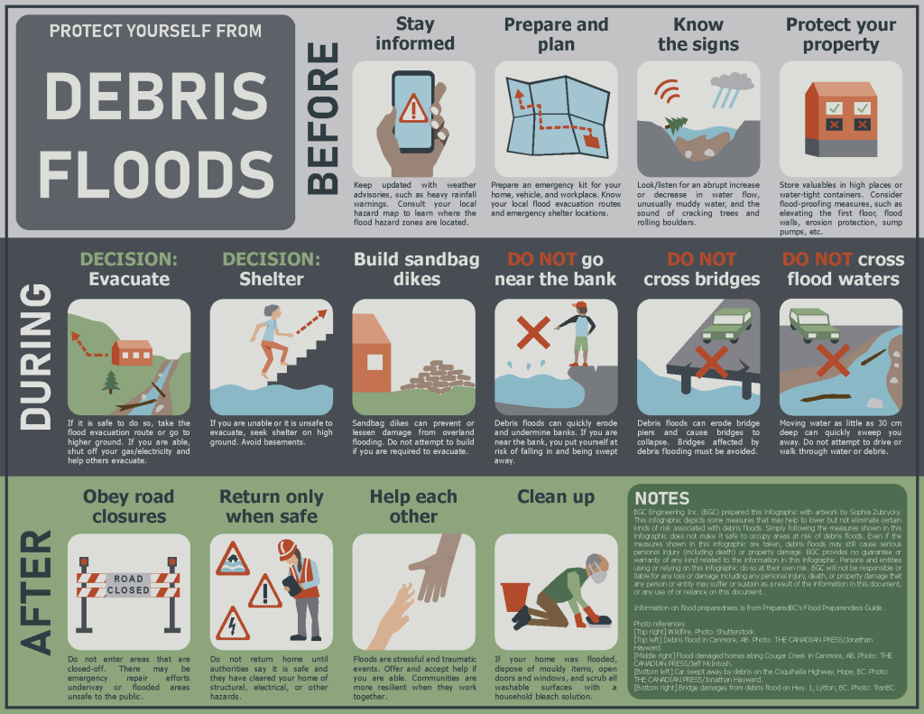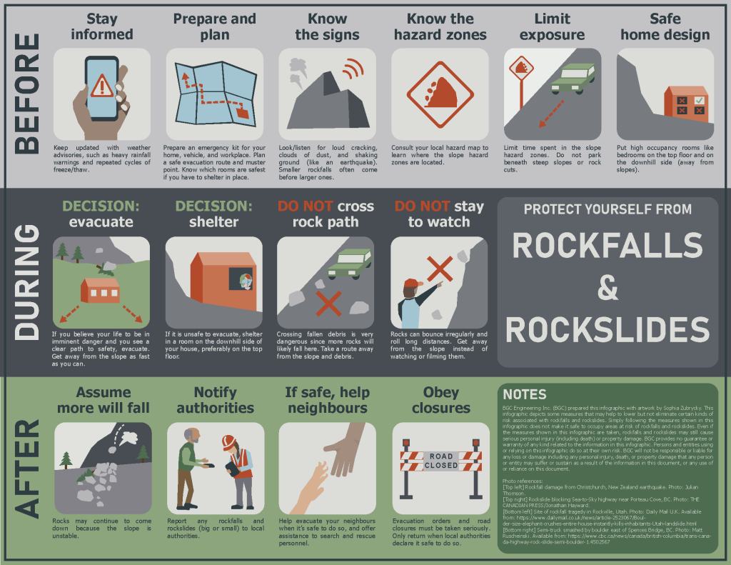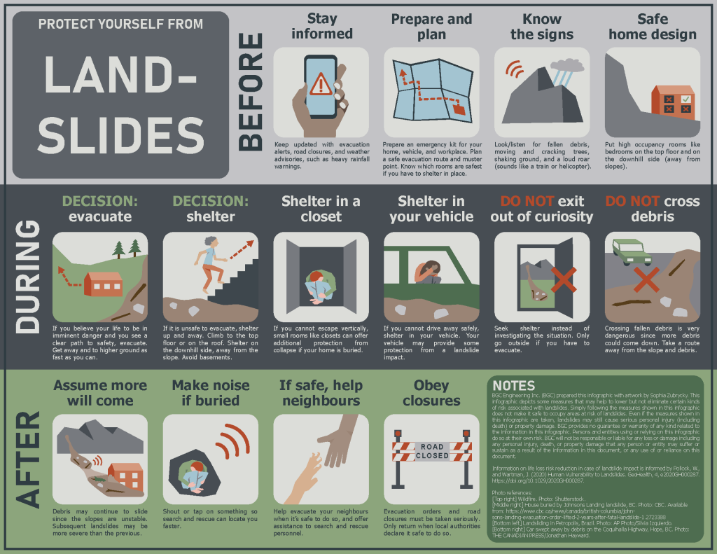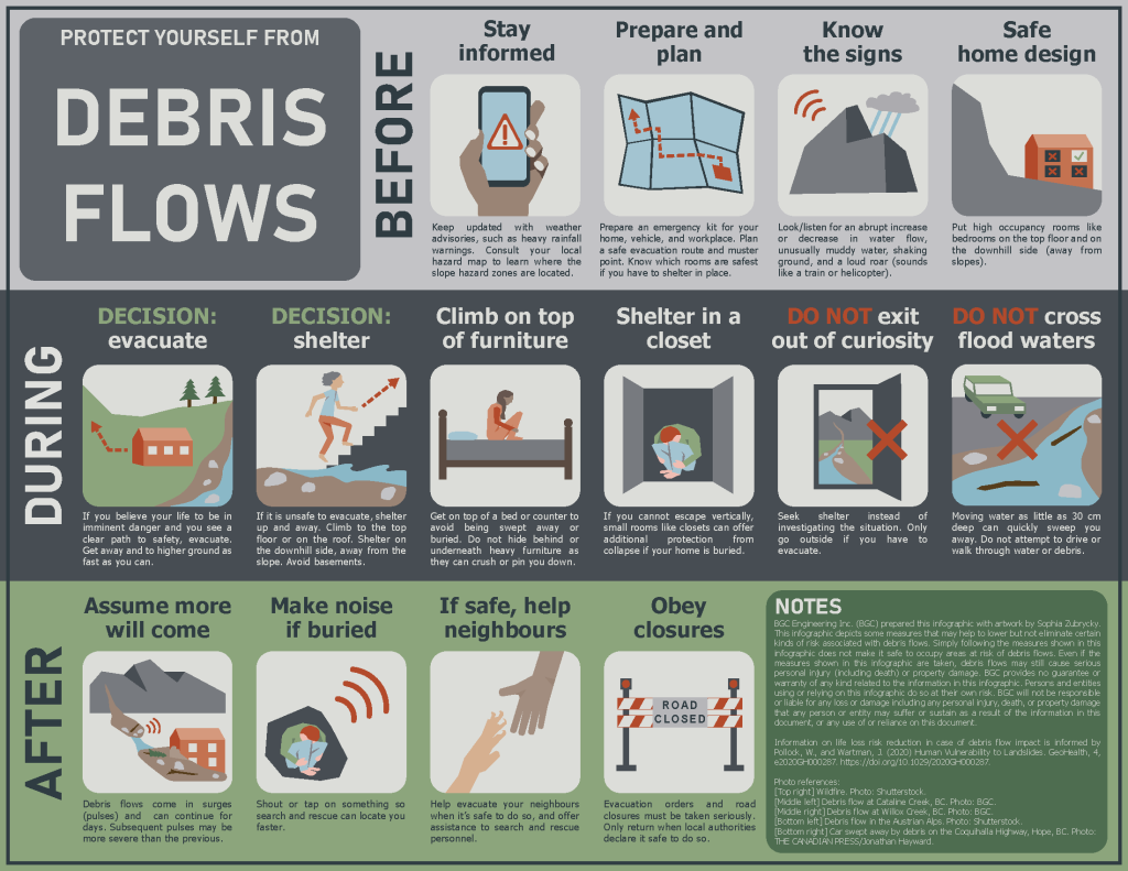 Communities across mountainous areas face a range of hazard types. These hazards can pose significant risks to public safety, and yet are not well understood by the general public. Through our engagement with communities, we have found a need for resources to educate the public about geohazards. It has been shown that relatively simple actions can dramatically increase the odds of surviving a landslide, but this information is not readily accessible to the general public (Pollock and Wartman 2020). What began as a non-structural, risk-reduction solution for a small community on Vancouver Island has evolved into a BGC Squared project to create a portfolio of infographics for various geohazard scenarios. We designed infographics for debris flows, rockfalls, rockslides, and landslides using practical experience from BGCers who have worked in geohazard disaster response and feedback from world-class disaster and risk-communication experts. The 2-sided illustrations include a hazard definition on one side and practical actions on the other. These educational resources can be made available to any community or client that sees a need for them.