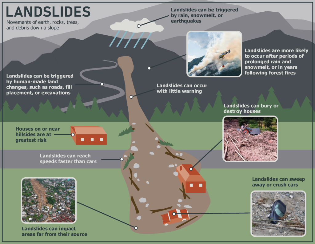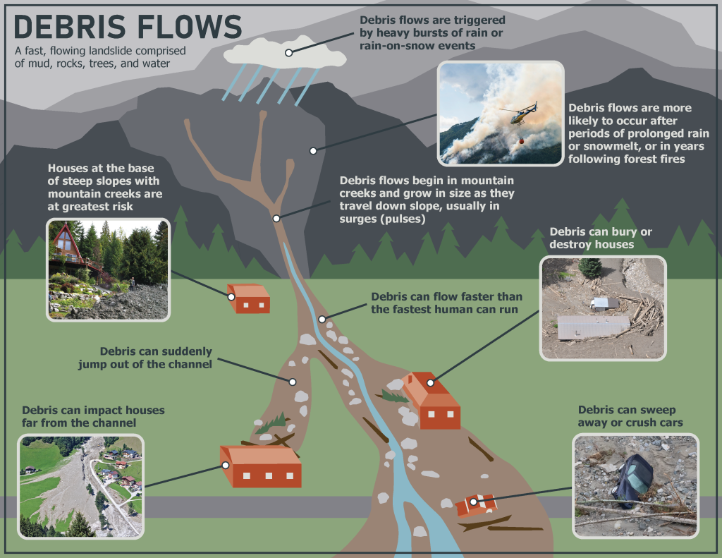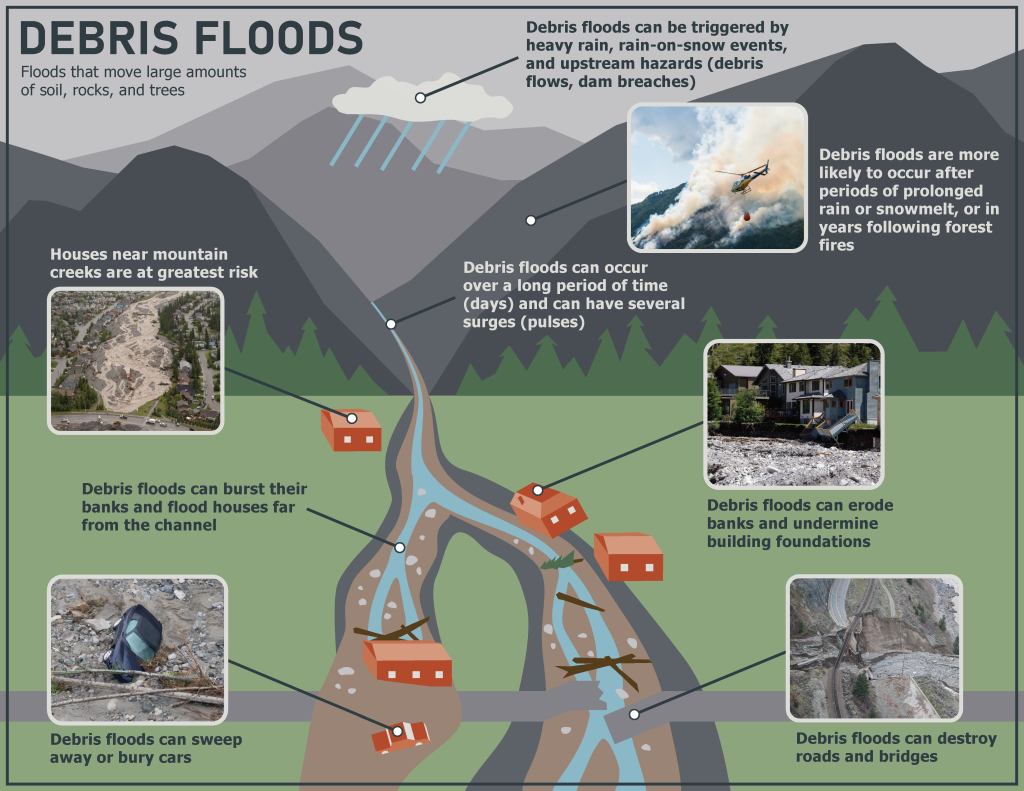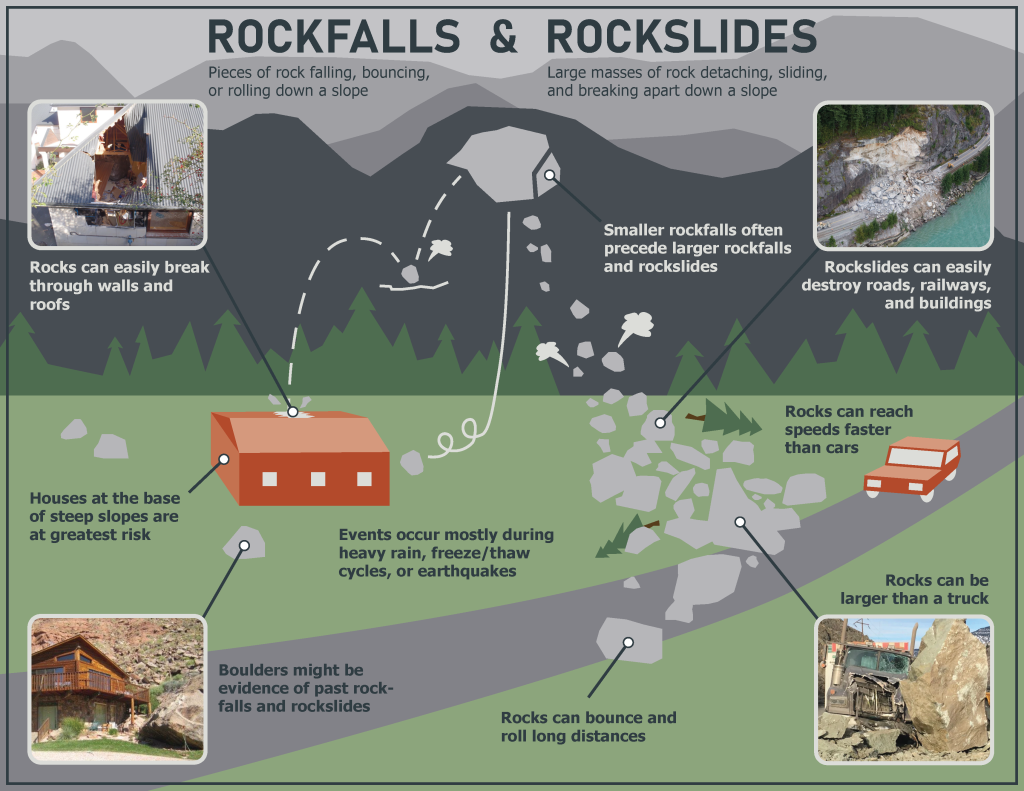 Communities across mountainous areas face a range of hazard types. These hazards can pose significant risks to public safety, and yet are not well understood by the general public. Through our engagement with communities, we have found a need for resources to educate the public about geohazards. It has been shown that relatively simple actions can dramatically increase the odds of surviving a landslide, but this information is not readily accessible to the general public (Pollock and Wartman 2020). What began as a non-structural, risk-reduction solution for a small community on Vancouver Island has evolved into a BGC Squared project to create a portfolio of infographics for various geohazard scenarios. We designed infographics for debris flows, rockfalls, rockslides, and landslides using practical experience from BGCers who have worked in geohazard disaster response and feedback from world-class disaster and risk-communication experts. The 2-sided illustrations include a hazard definition on one side and practical actions on the other. These educational resources can be made available to any community or client that sees a need for them.