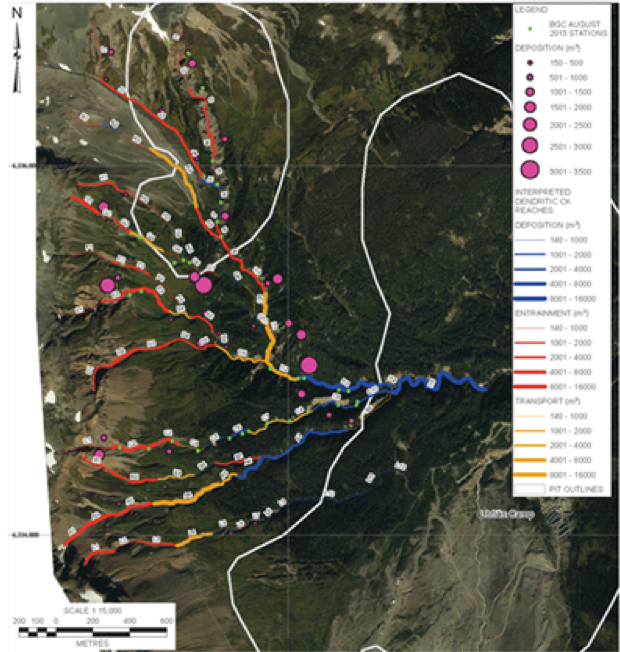 Galore Creek Mining Corporation (GCMC) is carrying out feasibility studies for the development of their Galore Creek Mine. In the current development plan, water from Dendritic Creek will be intercepted and diverted away from and around a proposed open pit. This current project refines preliminary debris flow volume estimates that were determined during an initial geohazards review of all components of the proposed Galore Creek Mine. BGC Engineering Inc. (BGC) identified that debris flows along Dendritic Creek had the potential to impact the water diversion intake. The potential debris flow volumes within the Dendritic Creek drainage system were estimated by modifying an existing debris flow sediment budget approach based on site specific observations and mapping. In addition, BGC presented a conceptual assessment of potential debris-flow mitigation measures.