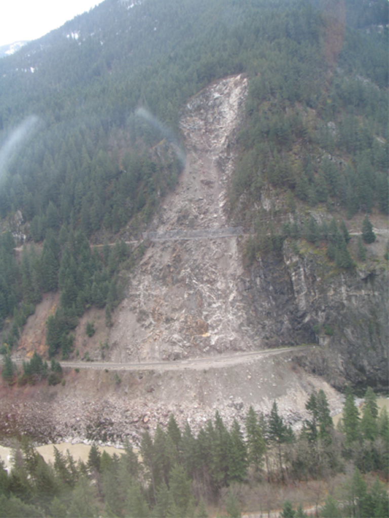 Following a rock slide that closed a Canadian mainline railway, a railway company retained BGC to design and carry out rock slope stabilization. This included a large scaling and trim blasting program, followed by rock fall modelling, and design and installation of a 100 m long, 3,000 kJ rock fall net system. Particular challenges included: