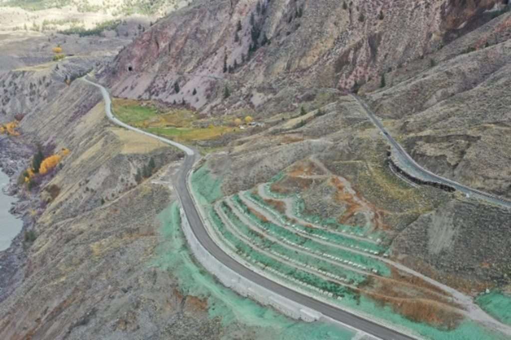 The work included slide stabilization and highway re-alignment and incorporates approximately 275, 2.5-metre square concrete anchor blocks with post-tensioned 30 m long 66 mm diameter 1035 MPa (150 ksi) double corrosion-protected threadbar soil anchors above the highway. A tied-back concrete tangent pile wall comprising 150 x 1.5 m diameter drilled reinforced concrete shafts with an integral concrete cap beam retaining wall and guard rail along the outer edge of the highway. The anchor loads are monitored using vibrating wire load cells with real-time data acquisition, upload, data reduction, and plotting. This significant slide stabilization project resulted in the return of a properly graded and paved highway with a 60 km/h speed limit through the slide area and removes this long-term transportation bottleneck for the people of Lillooet and the Xaxli’p First Nation.